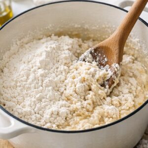 - Add all your flour at once directly into the wet mixture. Grab a sturdy spoon or wooden spoon and stir everything together until all the dry flour is incorporated and you have a sticky, shaggy dough. This will look messy. That's correct. You're not going for smooth here—you just want everything uniformly wet. Use a silicone spatula to scrape any bits clinging to your spoon. Here's a pro tip: if your dough looks too wet and soup-like, add 1-2 tablespoons more flour and stir it in. If it looks too dry and crumbly, add water by the tablespoon until it comes together into a wet dough. You want something that looks sticky enough to be slightly challenging to handle, but not so wet that it's basically batter.