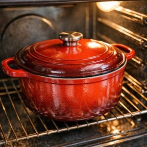 You can, but you’ll lose that perfect crust. A regular covered baking dish (even an oven-safe pot with a lid) works in a pinch. Cast iron Dutch ovens are ideal, but enameled ones work equally well. The key is creating a steamy environment, so the lid is essential.
