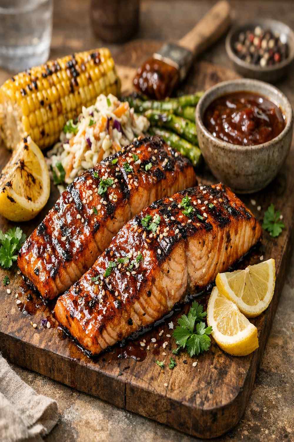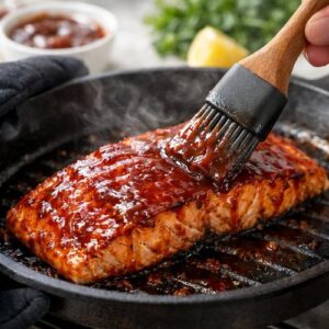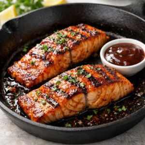 - Let the salmon sit on the pan for about 2 minutes before plating. This allows the residual heat to finish cooking the very center. Serve with extra BBQ sauce on the side if you want, and get it to the table while it's still warm. The glaze will firm up slightly as it cools.