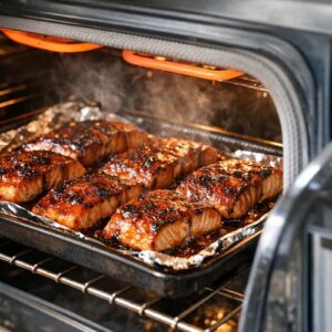 - Move your oven rack to the highest position, as close to the broiler element as possible. Turn your broiler on to high and let it preheat for about 3-5 minutes. You want it genuinely hot. While that's warming, take your salmon out of the fridge so it's closer to room temperature—this helps it cook more evenly.