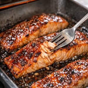 - Return the pan to the broiler for another 3 minutes. The salmon should start flaking slightly at the edges if you test it gently with a fork. The sauce will deepen in color.