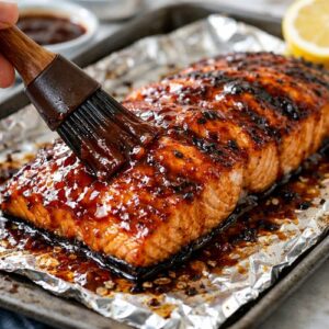 - Using a pastry brush or the back of a spoon, spread about one-third of your BBQ sauce across the top of the salmon. Don't worry about measuring exactly—this is about intuition. You want it thick enough that it'll caramelize but not so thick that it burns. If you're adding the honey or maple syrup, mix it into your sauce now for added depth.